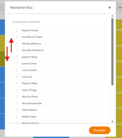 Podrás organizar el orden en el que deben aparecer en este cuadrante personalizado, arrastrando las filas. Si la agrupación del cuadrante la has realizado por empleados, podrás ordenar cómo deben mostrarse los trabajadores en el cuadrante. Si has agrupado por equipos, ordenarás estos mismos, etc. Pulsa en Guardar para preservar los cambios.