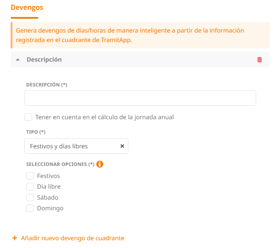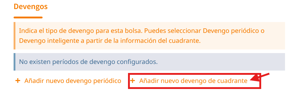 - ➕ Añadir nuevo devengo de cuadrante: Podemos crear nuevos devengos dentro de la misma bolsa. Para ello, hacemos clic en este campo y nos aparecerá para establecer los campos de este nuevo devengo.