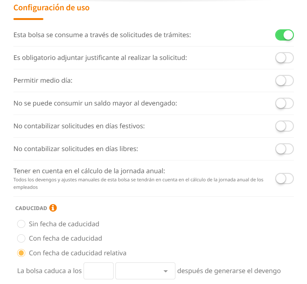 - "No se puede consumir un saldo mayor al devengado": Podemos configurar si los empleados pueden pedir de su bolsa horas/días de más y quedarse con saldo negativo (con el check desactivado) o si, por el contrario, los empleados solo podrán solicitar lo que tienen disponible y no les permitirá solicitar de más (activando el check).