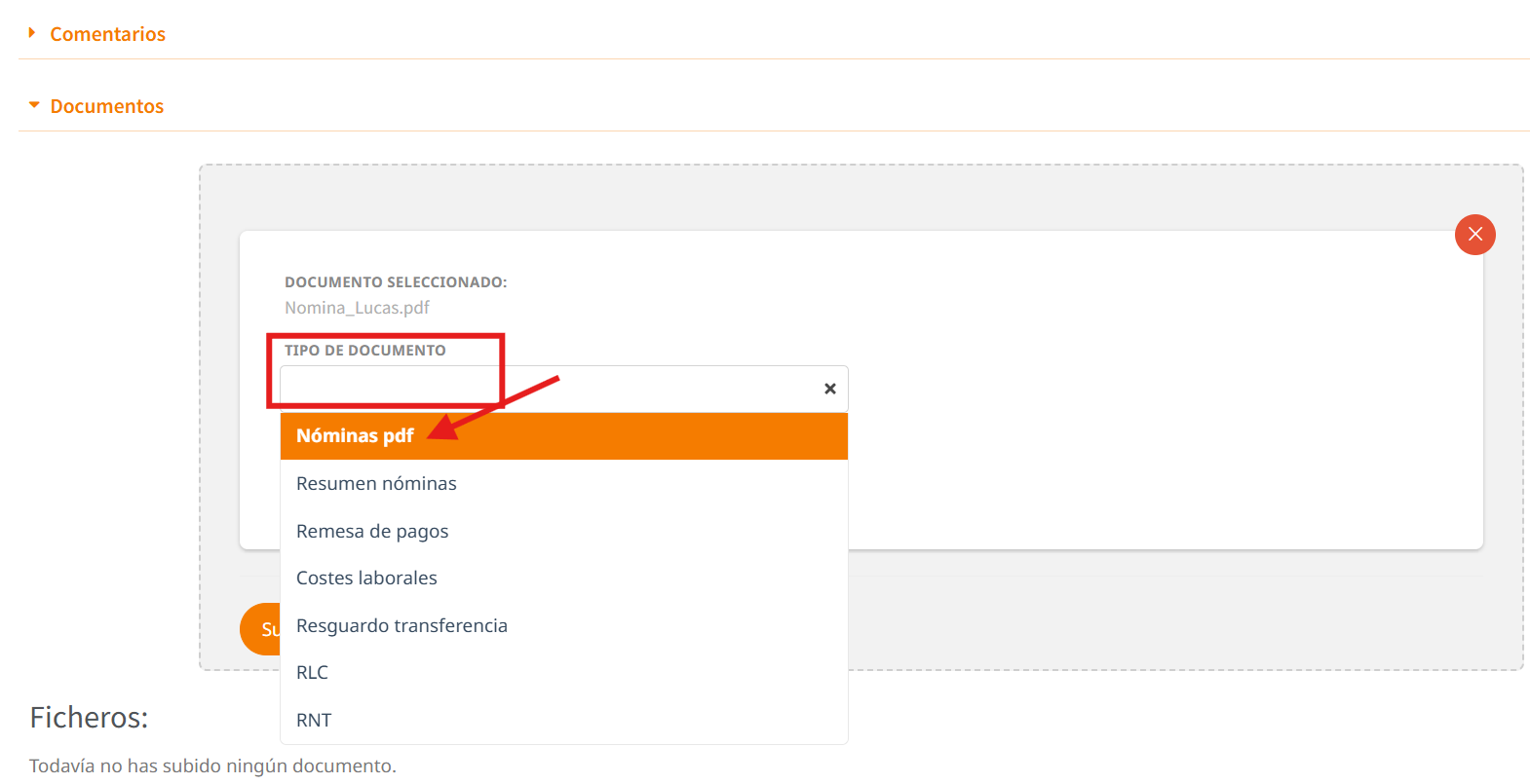 - Que el tipo de documento seleccionado al subir el PDF sea "nóminas pdf". Si se selecciona el tipo de "resumen nóminas" no se realizará el reparto, ya que es un tipo de documento interno.